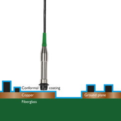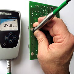 For calibration, the probe is placed on a painted but component-free copper ground plane, and the paint thickness is measured there. Particularly advantageous are the small dimensions of the probe and its high measuring accuracy. The thickness values determined in this way are then used as input parameters for calibration of the optical coating thickness measurement.