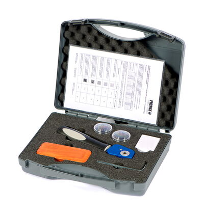 The cylindrical cutting system consists of 6 cutting edges with 6 respectively 11 grinds each. High quality multiple blade devices made of tool steel ensure a long durability. After attrition of one cutting edge the device can easily be rotated to continue with a new unused edge. A hex key for an easy exchange of the blade, a brush to clean the scarified surface, as well as a magnifying glass for the evaluation of the edges cut are included in the delivery.
