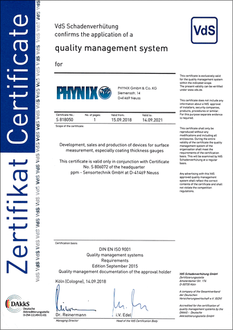 PHYNIX GmbH & Co. KG has been successfully certified according to DIN EN ISO 9001: 2015. This is the result of an audit that was carried out at the beginning of September 2018 in the premises of PHYNIX GmbH & Co. KG in Neuss. Two auditors from the company VdS Schadenverhütung GmbH from Cologne examined all aspects of the standard, in particular the risk and opportunity management as well as the structured handling of the resource "knowledge".