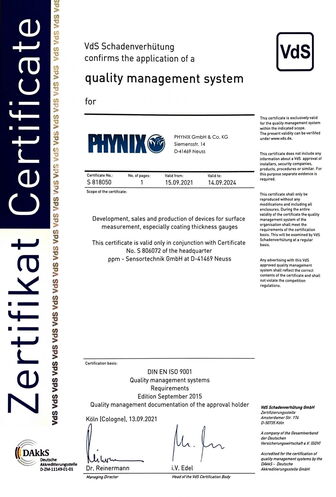 The re-audit according to DIN EN ISO 9001: 2015 applies to the scope “development, manufacture and sale of devices for surface measurement, in particular coating thickness measuring devices”. With the ISO certificate, we document for our customers that the processes at PHYNIX are transparent and that we attach particular importance to quality.